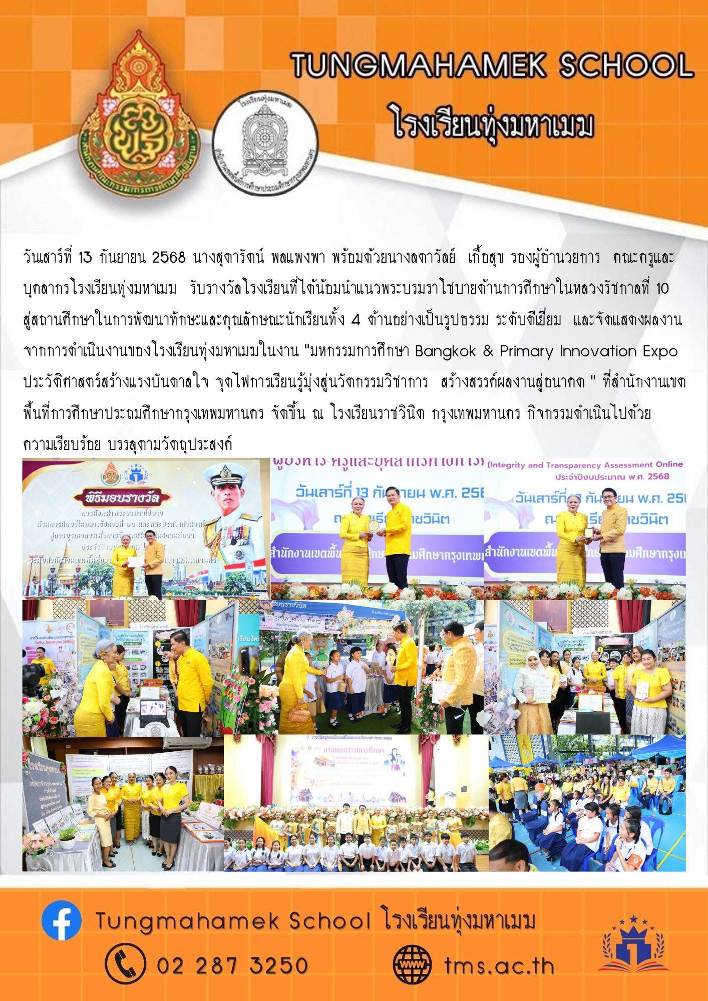 วันเสาร์ที่ 13 กันยายน 2568 นางสุดารัตน์ พลแพงพา พร้อมด้วยนางลดาวัลย์ เกื้อสุข รองผู้อำนวยการ คณะครูและบุคลากรโรงเรียนทุ่งมหาเมฆ รับรางวัลโรงเรียนที่ได้น้อมนำแนวพระบรมราโชบายด้านการศึกษาในหลวงรัชกาลที่ 10 สู่สถานศึกษาในการพัฒนาทักษะและคุณลักษณะนักเรียนทั้ง 4 ด้านอย่างเป็นรูปธรรม ระดับดีเยี่ยม และจัดแสดงผลงานจากการดำเนินงานของโรงเรียนทุ่งมหาเมฆในงาน "มหกรรมการศึกษา Bangkok & Primary Innovation Expo ประวัติศาสตร์สร้างแรงบันดาลใจ จุดไฟการเรียนรู้มุ่งสู่นวัตกรรมวิชาการ สร้างสรรค์ผลงานสู่อนาคต " ที่สำนักงานเขตพื้นที่การศึกษาประถมศึกษากรุงเทพมหานคร จัดขึ้น ณ โรงเรียนราชวินิต กรุงเทพมหานคร กิจกรรมดำเนินไปด้วยความเรียบร้อย บรรลุตามวัตถุประสงค์