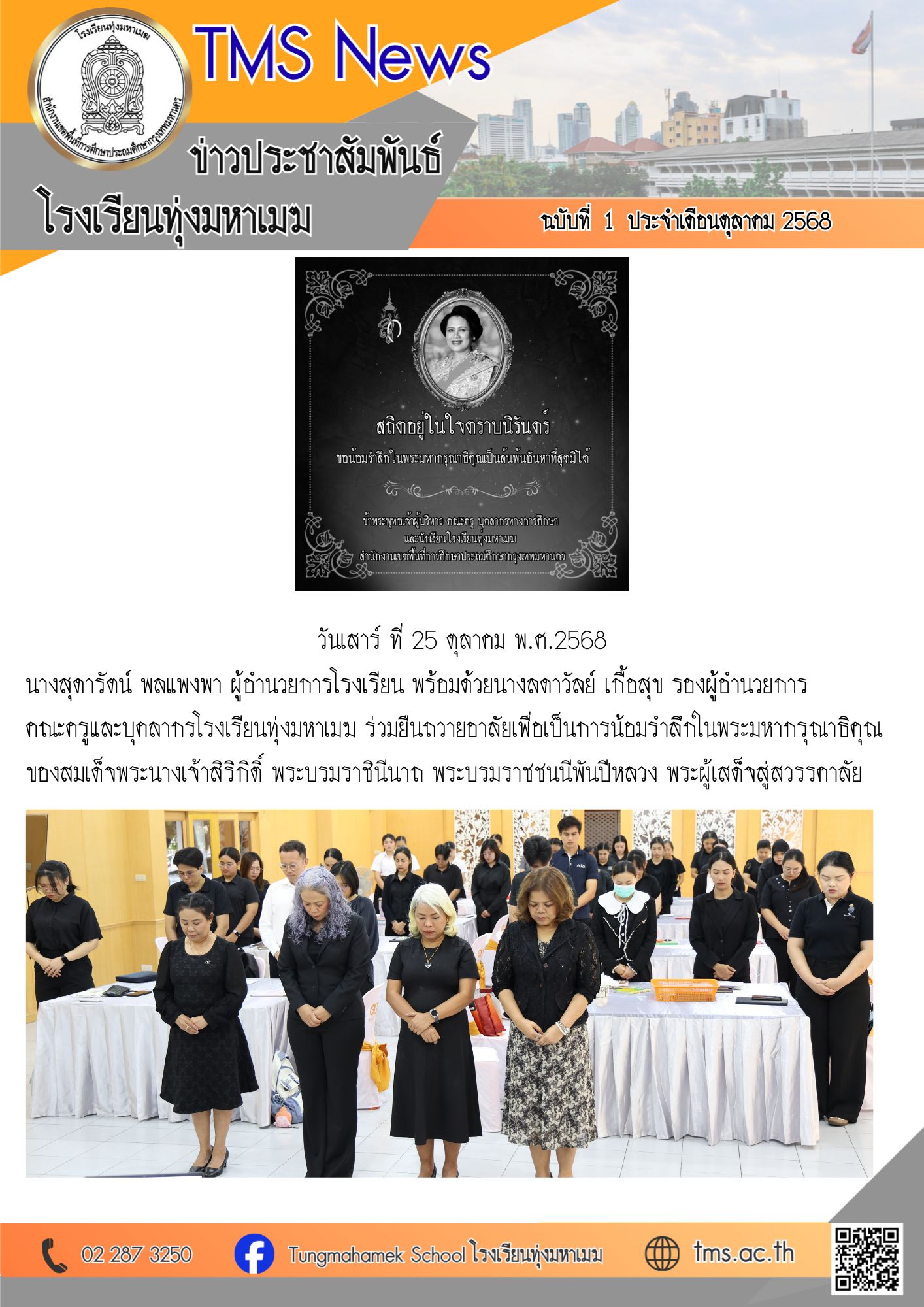 นางสุดารัตน์ พลแพงพา ผู้อำนวยการโรงเรียน พร้อมด้วยนางลดาวัลย์ เกื้อสุข รองผู้อำนวยการ คณะครูและบุคลากรโรงเรียนทุ่งมหาเมฆ ร่วมยืนถวายอาลัยเพื่อเป็นการน้อมรำลึกในพระมหากรุณาธิคุณของสมเด็จพระนางเจ้าสิริกิติ์ พระบรมราชินีนาถ พระบรมราชชนนีพันปีหลวง พระผู้เสด็จสู่สวรรคาลัย
