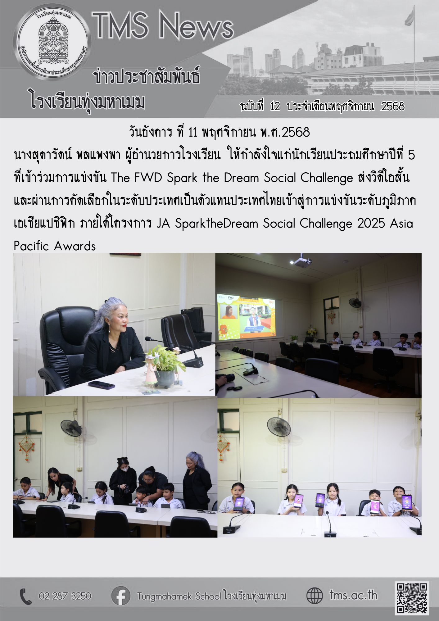 นางสุดารัตน์ พลแพงพา ผู้อำนวยการโรงเรียน  ให้กำลังใจแก่นักเรียนประถมศึกษาปีที่ 5 ที่เข้าร่วมการแข่งขัน The FWD Spark the Dream Social Challenge ส่งวิดีโอสั้น และผ่านการคัดเลือกในระดับประเทศเป็นตัวแทนประเทศไทยเข้าสู่การแข่งขันระดับภูมิภาคเอเชียแปซิฟิก ภายใต้โครงการ JA SparktheDream Social Challenge 2025 Asia Pacific Awards