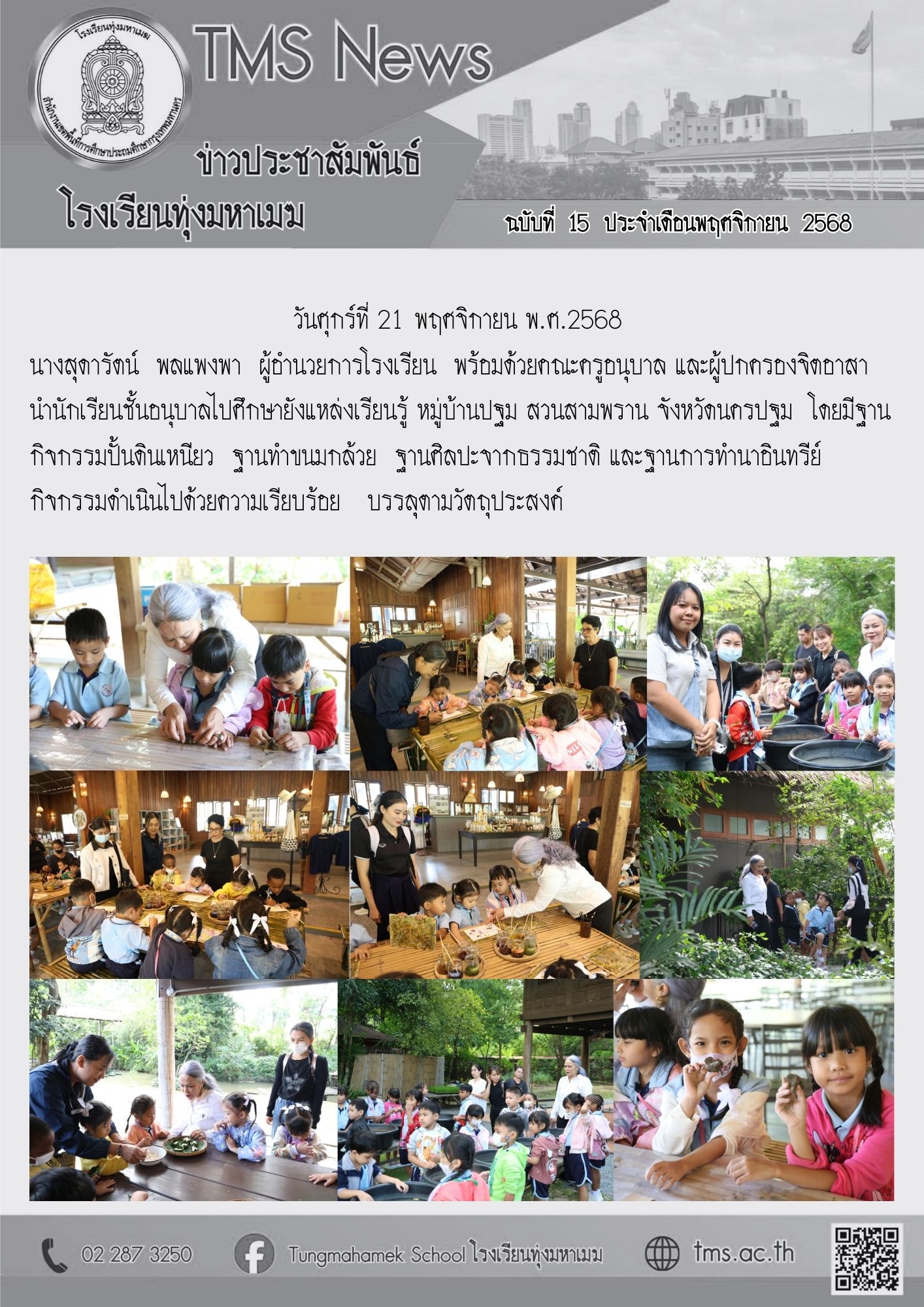 วันศุกร์ที่ 21 พฤศจิกายน พ.ศ.2568 นางสุดารัตน์ พลแพงพา ผู้อำนวยการโรงเรียน พร้อมด้วยคณะครูอนุบาล และผู้ปกครองจิตอาสา นำนักเรียนชั้นอนุบาลไปศึกษายังแหล่งเรียนรู้ หมู่บ้านปฐม สวนสามพราน จังหวัดนครปฐม โดยมีฐานกิจกรรมปั้นดินเหนียว ฐานทำขนมกล้วย ฐานศิลปะจากธรรมชาติ และฐานการทำนาอินทรีย์ กิจกรรมดำเนินไปด้วยความเรียบร้อย บรรลุตามวัตถุประสงค์