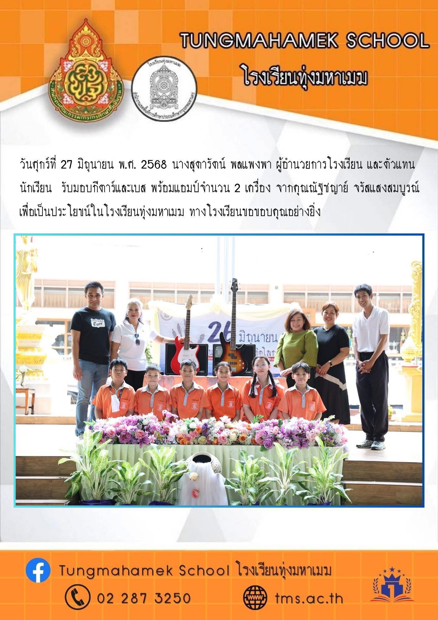 วันศุกร์ที่ 27 มิถุนายน พ.ศ. 2568 นางสุดารัตน์ พลแพงพา ผู้อำนวยการโรงเรียน และตัวแทนนักเรียน รับมอบกีตาร์และเบส พร้อมแอมป์จำนวน 2 เครื่อง จากคุณณัฐชญาย์ จรัสแสงสมบูรณ์ เพื่อเป็นประโยขน์ในโรงเรียนทุ่งมหาเมฆ ทางโรงเรียนขอขอบคุณอย่างยิ่ง