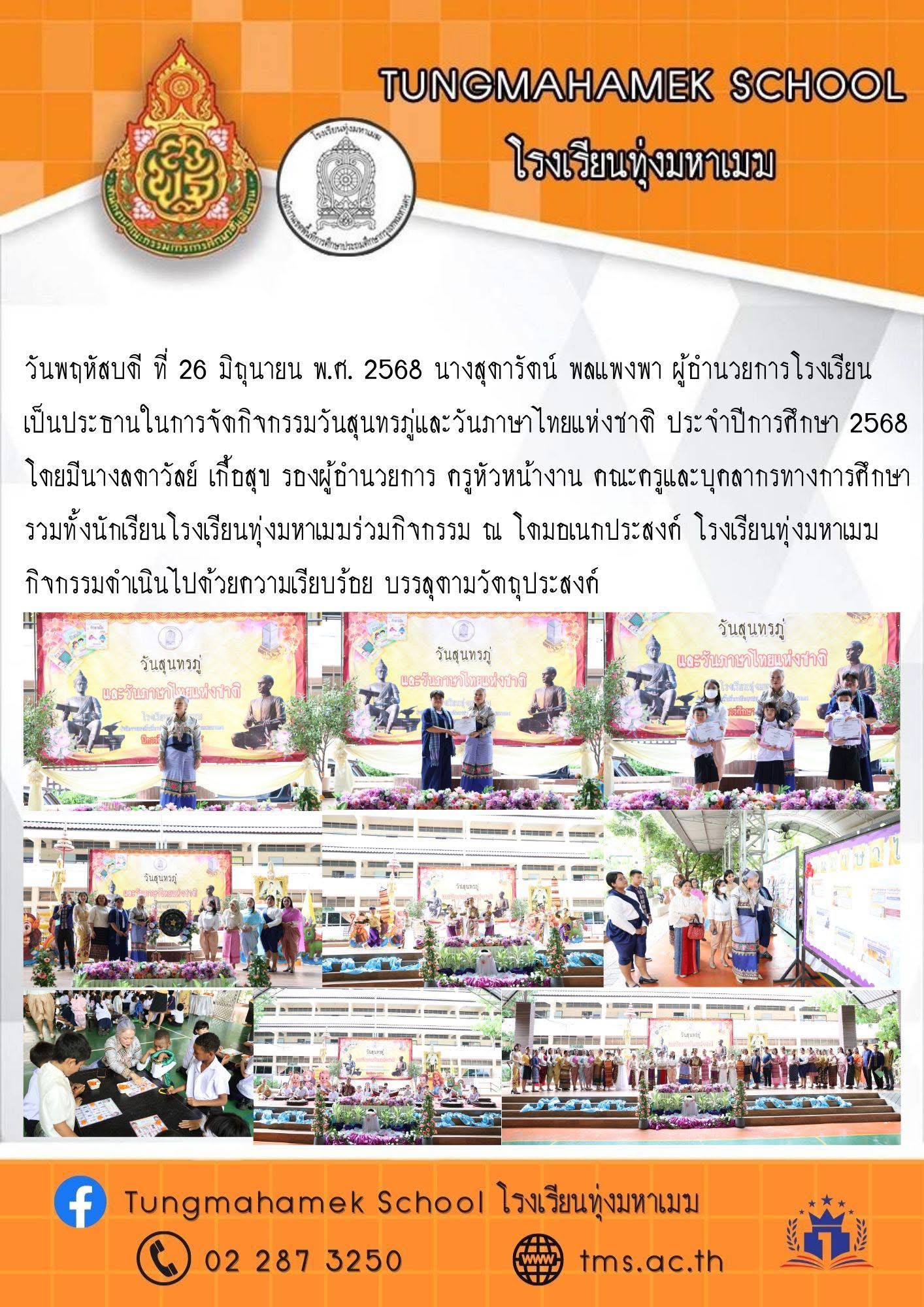 วันพฤหัสบดี ที่ 26 มิถุนายน พ.ศ. 2568 นางสุดารัตน์ พลแพงพา ผู้อำนวยการโรงเรียน เป็นประธานในการจัดกิจกรรมวันสุนทรภู่และวันภาษาไทยแห่งชาติ ประจำปีการศึกษา 2568 โดยมีนางลดาวัลย์ เกื้อสุข รองผู้อำนวยการ ครูหัวหน้างาน คณะครูและบุคลากรทางการศึกษา รวมทั้งนักเรียนโรงเรียนทุ่งมหาเมฆร่วมกิจกรรม ณ โดมอเนกประสงค์ โรงเรียนทุ่งมหาเมฆ กิจกรรมดำเนินไปด้วยความเรียบร้อย บรรลุตามวัตถุประสงค์