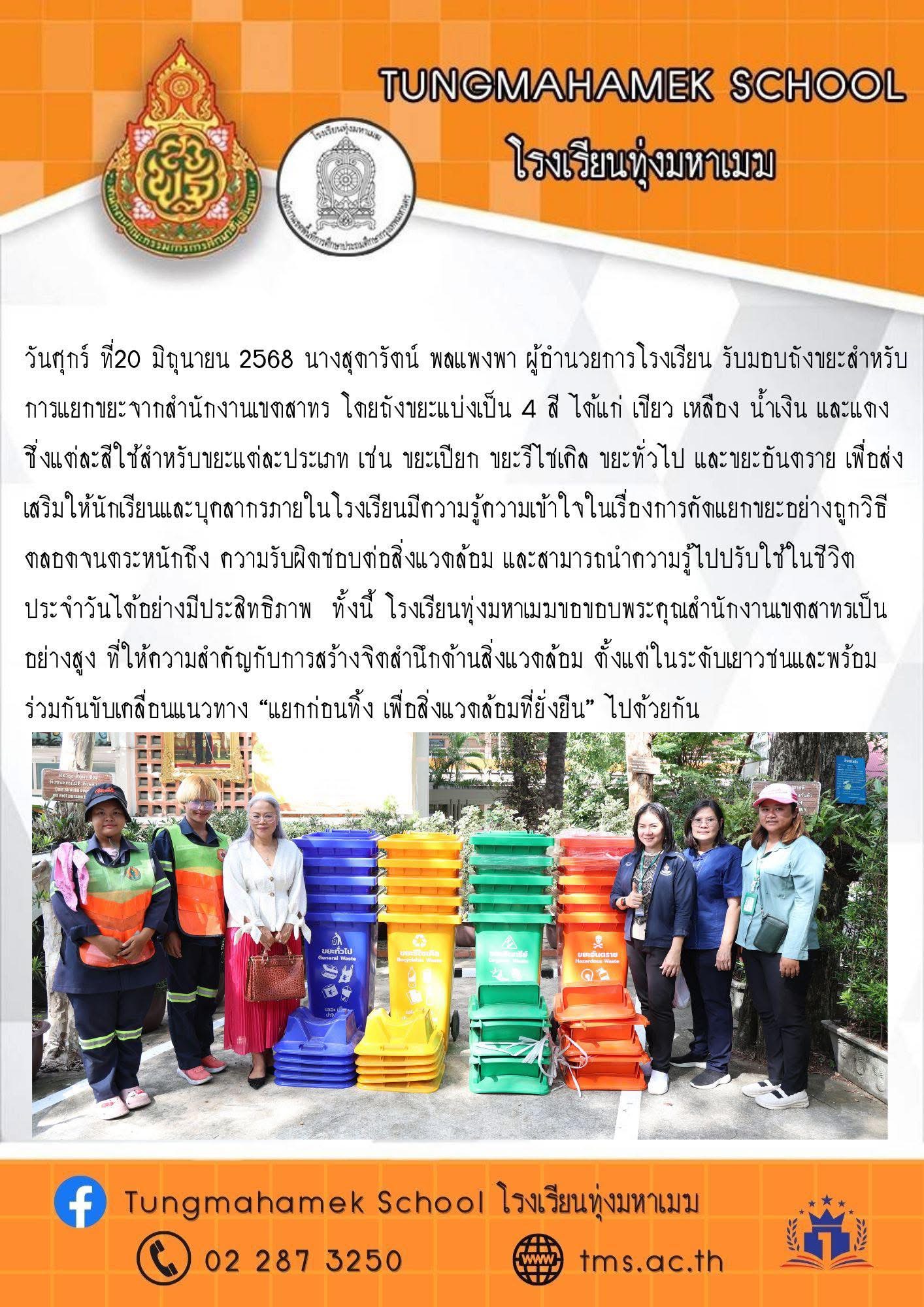 วันศุกร์ ที่20 มิถุนายน 2568 นางสุดารัตน์ พลแพงพา ผู้อำนวยการโรงเรียน รับมอบถังขยะสำหรับการแยกขยะจากสำนักงานเขตสาทร โดยถังขยะแบ่งเป็น 4 สี ได้แก่ เขียว เหลือง น้ำเงิน และแดง ซึ่งแต่ละสีใช้สำหรับขยะแต่ละประเภท เช่น ขยะเปียก ขยะรีไซเคิล ขยะทั่วไป และขยะอันตราย เพื่อส่งเสริมให้นักเรียนและบุคลากรภายในโรงเรียนมีความรู้ความเข้าใจในเรื่องการคัดแยกขยะอย่างถูกวิธี ตลอดจนตระหนักถึง ความรับผิดชอบต่อสิ่งแวดล้อม และสามารถนำความรู้ไปปรับใช้ในชีวิตประจำวันได้อย่างมีประสิทธิภาพ ทั้งนี้ โรงเรียนทุ่งมหาเมฆขอขอบพระคุณสำนักงานเขตสาทรเป็นอย่างสูง ที่ให้ความสำคัญกับการสร้างจิตสำนึกด้านสิ่งแวดล้อม ตั้งแต่ในระดับเยาวชนและพร้อมร่วมกันขับเคลื่อนแนวทาง “แยกก่อนทิ้ง เพื่อสิ่งแวดล้อมที่ยั่งยืน” ไปด้วยกัน