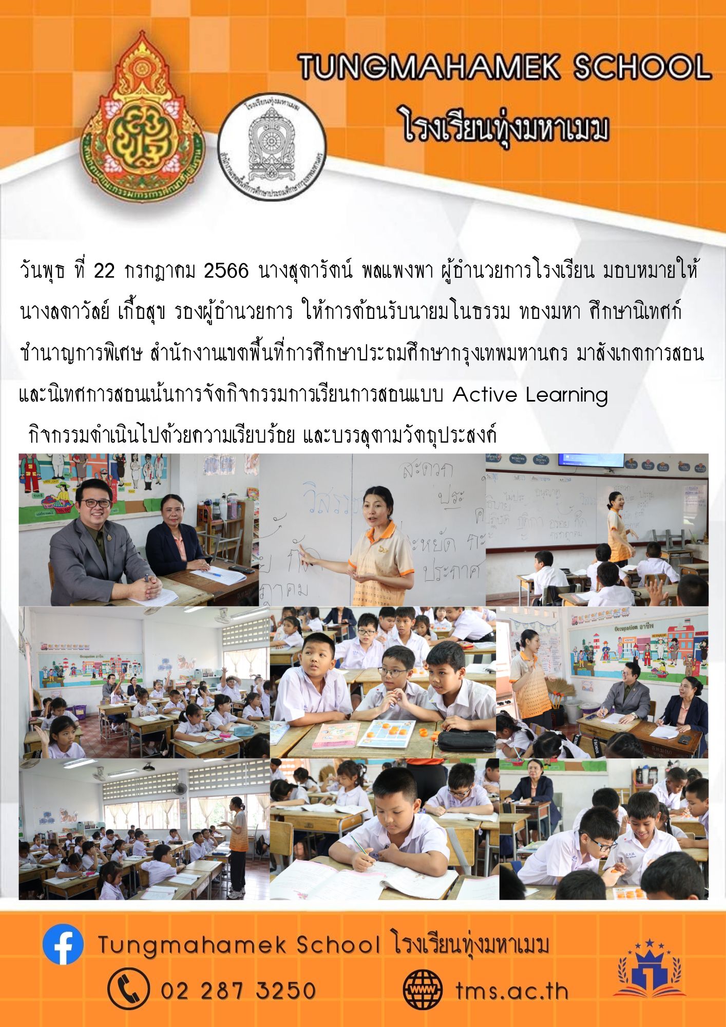 วันพุธ ที่ 22 กรกฎาคม 2566 นางสุดารัตน์ พลแพงพา ผู้อำนวยการโรงเรียน มอบหมายให้นางลดาวัลย์ เกื้อสุข รองผู้อำนวยการ ให้การต้อนรับนายมโนธรรม ทองมหา ศึกษานิเทศก์ชำนาญการพิเศษ สำนักงานเขตพื้นที่การศึกษาประถมศึกษากรุงเทพมหานคร มาสังเกตการสอนและนิเทศการสอนเน้นการจัดกิจกรรมการเรียนการสอนแบบ Active Learning กิจกรรมดำเนินไปด้วยความเรียบร้อย และบรรลุตามวัตถุประสงค์