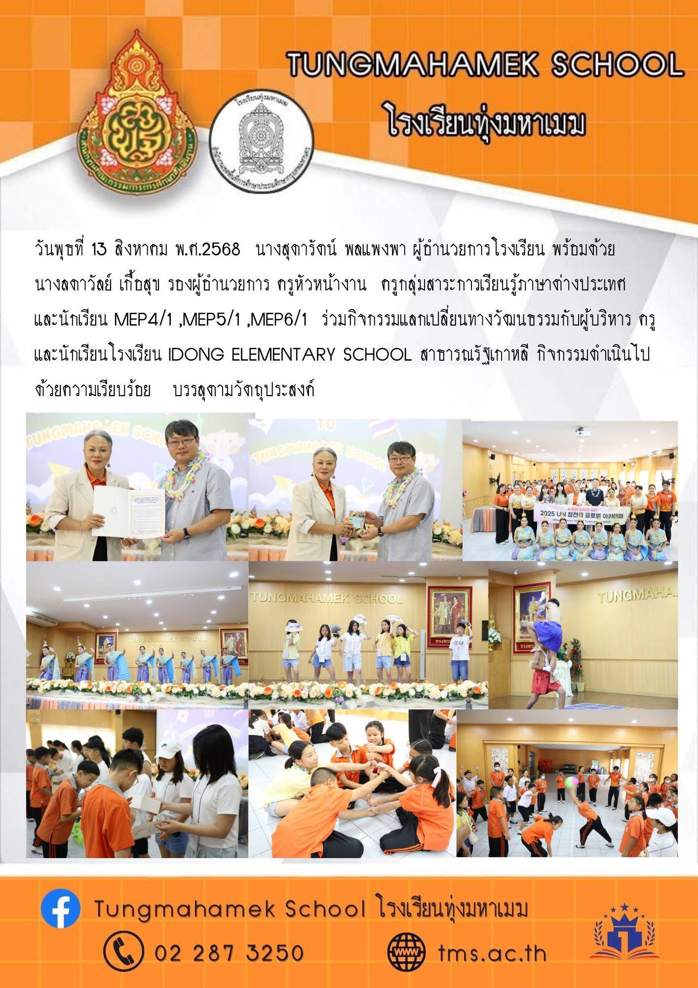 วันพุธที่ 13 สิงหาคม พ.ศ.2568 นางสุดารัตน์ พลแพงพา ผู้อำนวยการโรงเรียน พร้อมด้วยนางลดาวัลย์ เกื้อสุข รองผู้อำนวยการ ครูหัวหน้างาน ครูกลุ่มสาระการเรียนรู้ภาษาต่างประเทศและนักเรียน MEP4/1 ,MEP5/1 ,MEP6/1 ร่วมกิจกรรมแลกเปลี่ยนทางวัฒนธรรมกับผู้บริหาร ครู และนักเรียนโรงเรียน Idong Elementary School สาธารณรัฐเกาหลี กิจกรรมดำเนินไปด้วยความเรียบร้อย บรรลุตามวัตถุประสงค์