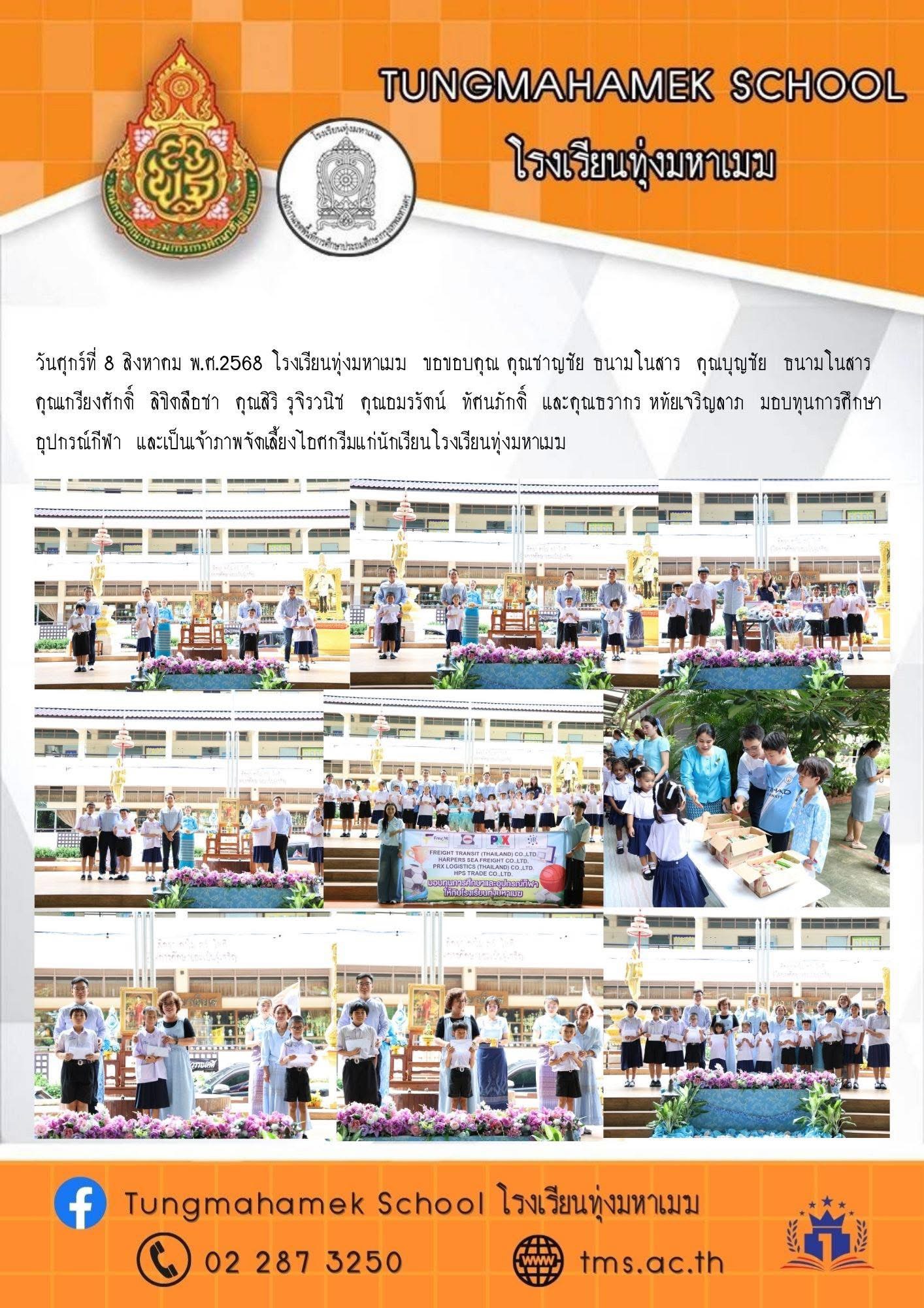 วันศุกร์ที่ 8 สิงหาคม พ.ศ.2568 โรงเรียนทุ่งมหาเมฆ ขอขอบคุณ คุณชาญชัย ธนามโนสาร คุณบุญชัย ธนามโนสาร คุณเกรียงศักดิ์ ลิขิตลือชา คุณสิริ รุจิรวนิช คุณอมรรัตน์ ทัศนภักดิ์ และคุณธรากร หทัยเจริญลาภ มอบทุนการศึกษา อุปกรณ์กีฬา และเป็นเจ้าภาพจัดเลี้ยงไอศกรีมแก่นักเรียนโรงเรียนทุ่งมหาเมฆ