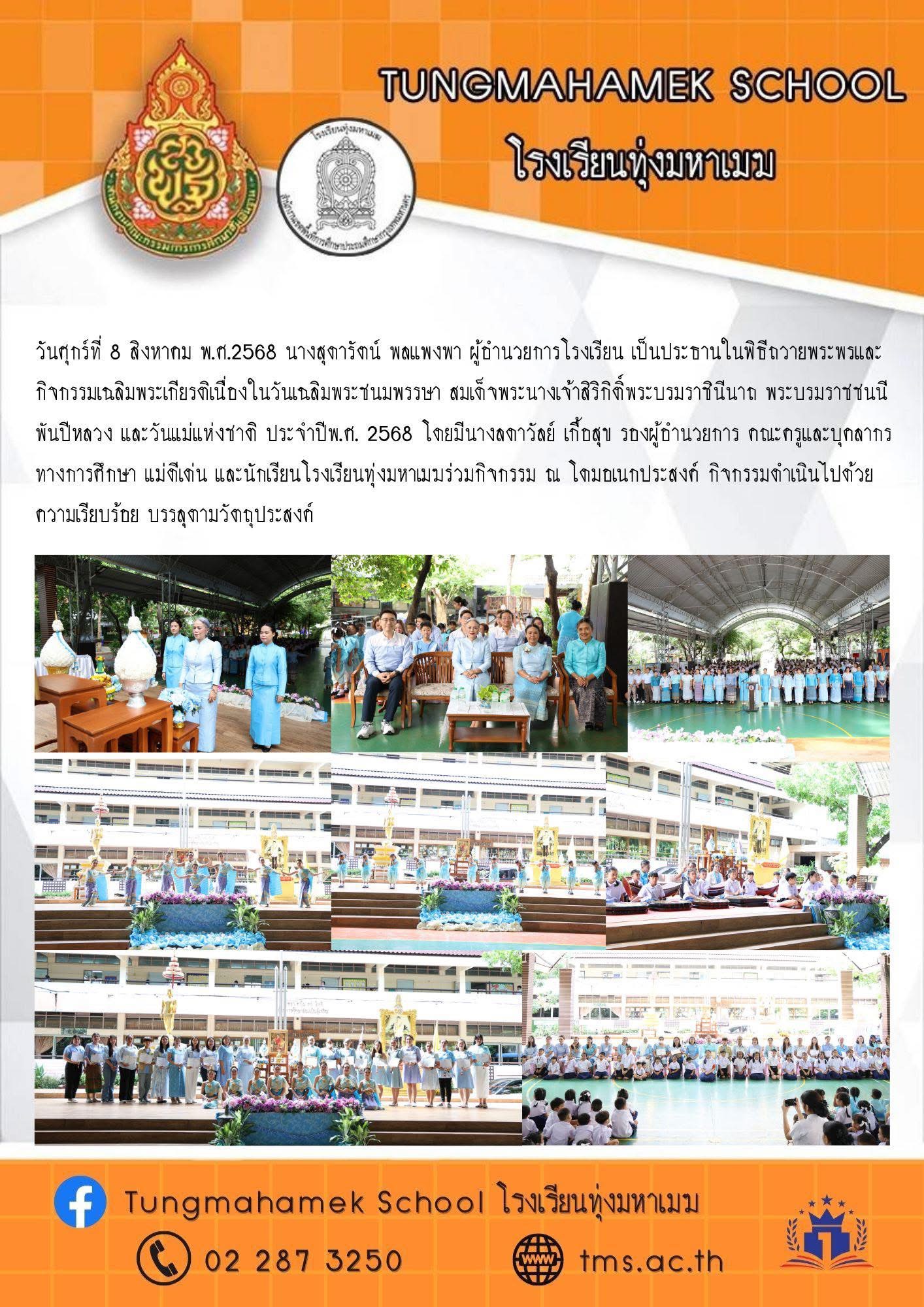 วันศุกร์ที่ 8 สิงหาคม พ.ศ.2568 นางสุดารัตน์ พลแพงพา ผู้อำนวยการโรงเรียน เป็นประธานในพิธีถวายพระพรและกิจกรรมเฉลิมพระเกียรติเนื่องในวันเฉลิมพระชนมพรรษา สมเด็จพระนางเจ้าสิริกิติ์พระบรมราชินีนาถ พระบรมราชชนนีพันปีหลวง และวันแม่แห่งชาติ ประจำปีพ.ศ. 2568 โดยมีนางลดาวัลย์ เกื้อสุข รองผู้อำนวยการ คณะครูและบุคลากรทางการศึกษา แม่ดีเด่น และนักเรียนโรงเรียนทุ่งมหาเมฆร่วมกิจกรรม ณ โดมอเนกประสงค์ กิจกรรมดำเนินไปด้วยความเรียบร้อย บรรลุตามวัตถุประสงค์