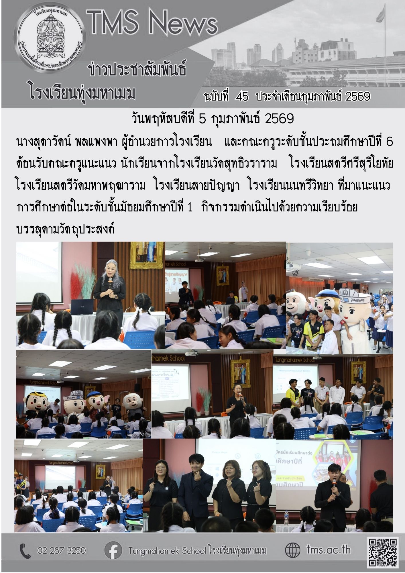 นางสุดารัตน์ พลแพงพา ผู้อำนวยการโรงเรียน และคณะครูระดับชั้นประถมศึกษาปีที่ 6 ต้อนรับคณะครูแนะแนว นักเรียนจากโรงเรียนวัดสุทธิวราราม โรงเรียนสตรีศรีสุริโยทัย โรงเรียนสตรีวัดมหาพฤฒาราม โรงเรียนสายปัญญา โรงเรียนนนทรีวิทยา ที่มาแนะแนวการศึกษาต่อในระดับชั้นมัธยมศึกษาปีที่ 1 กิจกรรมดำเนินไปด้วยความเรียบร้อย บรรลุตามวัตถุประสงค์