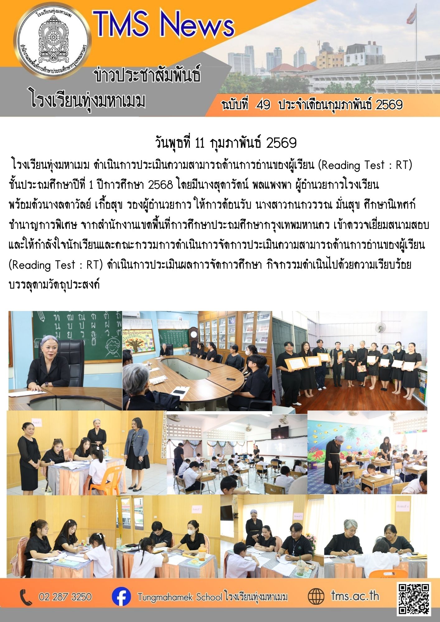 โรงเรียนทุ่งมหาเมฆ ดำเนินการประเมินความสามารถด้านการอ่านของผู้เรียน (Reading Test : RT)ชั้นประถมศึกษาปีที่ 1 ปีการศึกษา 2568 โดยมีนางสุดารัตน์ พลแพงพา ผู้อำนวยการโรงเรียน พร้อมด้วนางลดาวัลย์ เกื้อสุข รองผู้อำนวยการ ให้การต้อนรับ นางสาวกนกวรรณ มั่นสุข ศึกษานิเทศก์ชำนาญการพิเศษ จากสำนักงานเขตพื้นที่การศึกษาประถมศึกษากรุงเทพมหานคร เข้าตรวจเยี่ยมสนามสอบและให้กำลังใจนักเรียนและคณะกรรมการดำเนินการจัดการประเมินความสามารถด้านการอ่านของผู้เรียน (Reading Test : RT) ดำเนินการประเมินผลการจัดการศึกษา กิจกรรมดำเนินไปด้วยความเรียบร้อย บรรลุตามวัตถุประสงค์