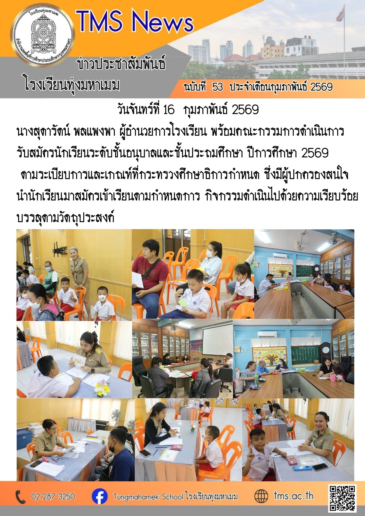 นางสุดารัตน์ พลแพงพา ผู้อำนวยการโรงเรียน พร้อมคณะกรรมการดำเนินการรับสมัครนักเรียนระดับชั้นอนุบาลและชั้นประถมศึกษา ปีการศึกษา 2569 ตามระเบียบการและเกณฑ์ที่กระทรวงศึกษาธิการกำหนด ซึ่งมีผู้ปกครองสนใจนำนักเรียนมาสมัครเข้าเรียนตามกำหนดการ กิจกรรมดำเนินไปด้วยความเรียบร้อย บรรลุตามวัตถุประสงค์