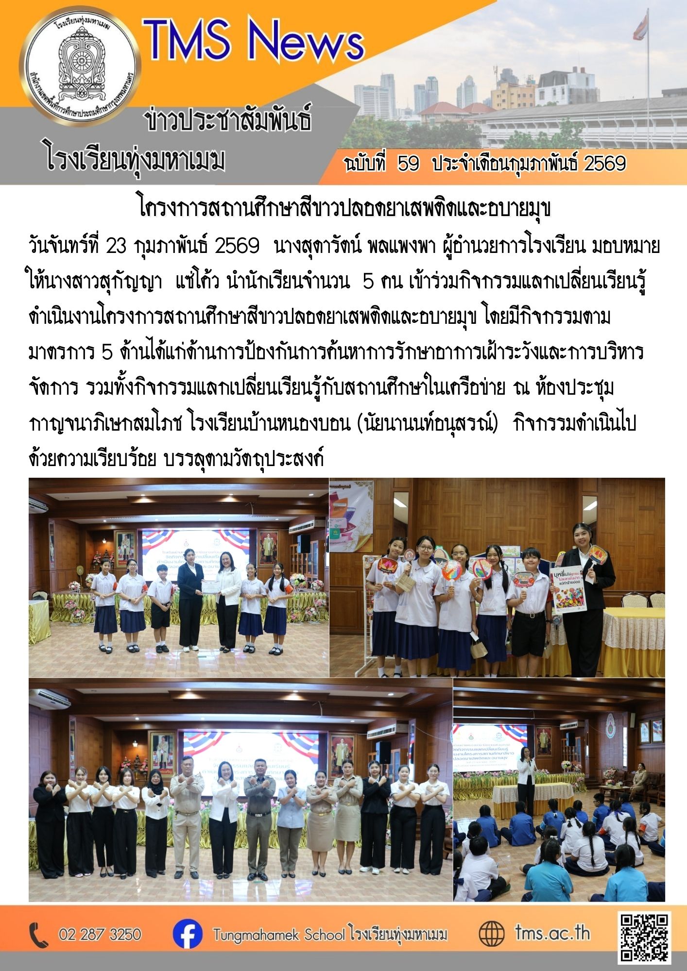 วันจันทร์ที่ 23 กุมภาพันธ์ 2569 นางสุดารัตน์ พลแพงพา ผู้อำนวยการโรงเรียน มอบหมายให้นางสาวสุกัญญา แซ่โค้ว นำนักเรียนจำนวน 5 คน เข้าร่วมกิจกรรมแลกเปลี่ยนเรียนรู้ ดำเนินงานโครงการสถานศึกษาสีขาวปลอดยาเสพติดและอบายมุข โดยมีกิจกรรมตามมาตรการ 5 ด้านได้แก่ด้านการป้องกันการค้นหาการรักษาอาการเฝ้าระวังและการบริหารจัดการ รวมทั้งกิจกรรมแลกเปลี่ยนเรียนรู้กับสถานศึกษาในเครือข่าย ณ ห้องประชุมกาญจนาภิเษกสมโภช โรงเรียนบ้านหนองบอน (นัยนานนท์อนุสรณ์) กิจกรรมดำเนินไปด้วยความเรียบร้อย บรรลุตามวัตถุประสงค์
