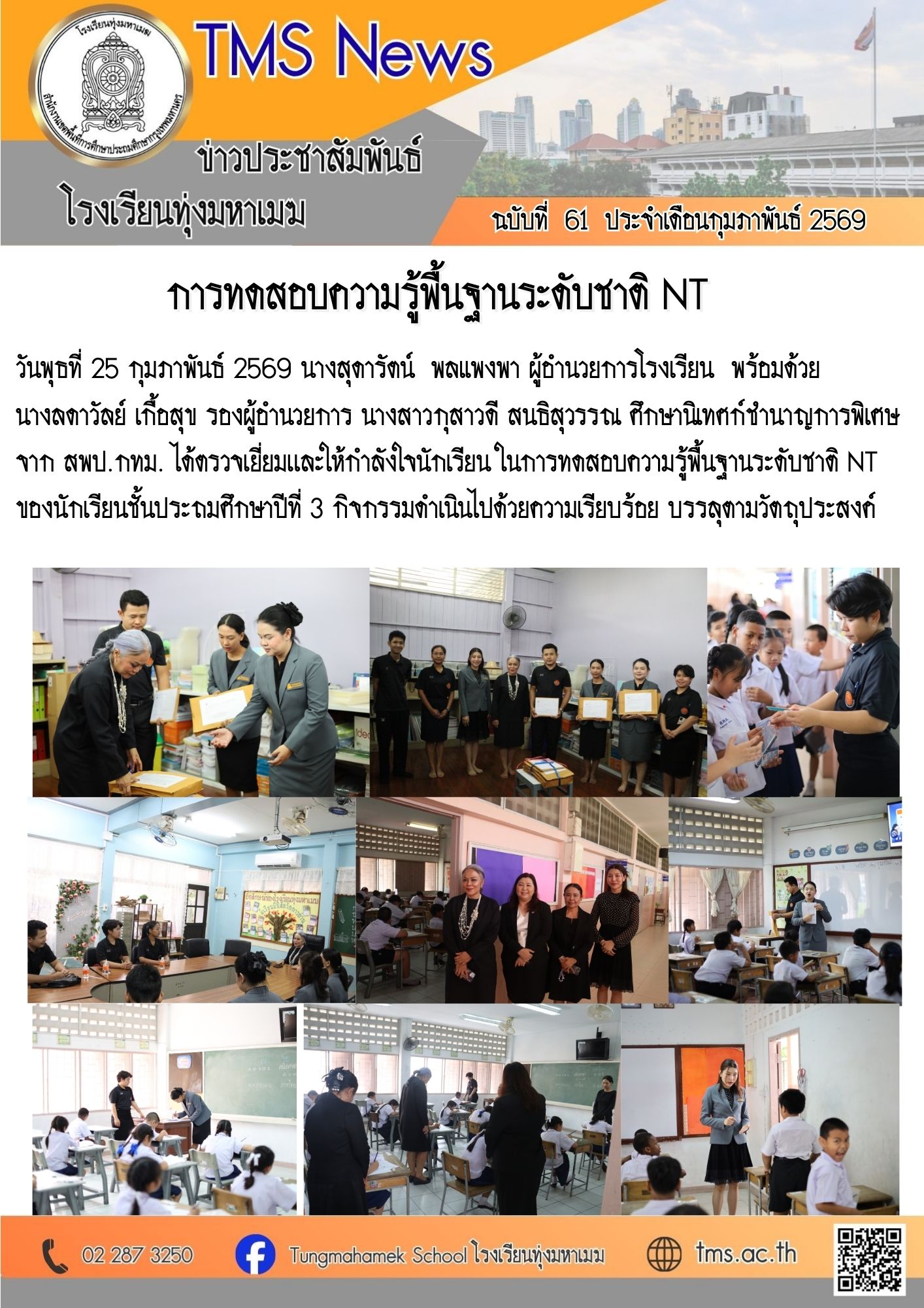วันพุธที่ 25 กุมภาพันธ์ 2569 นางสุดารัตน์ พลแพงพา ผู้อำนวยการโรงเรียน พร้อมด้วยนางลดาวัลย์ เกื้อสุข รองผู้อำนวยการ นางสาวกุสาวดี สนธิสุวรรณ ศึกษานิเทศก์ชำนาญการพิเศษ จาก สพป.กทม. ได้ตรวจเยี่ยมเเละให้กำลังใจนักเรียน ในการทดสอบความรู้พื้นฐานระดับชาติ NT ของนักเรียนชั้นประถมศึกษาปีที่ 3 กิจกรรมดำเนินไปด้วยความเรียบร้อย บรรลุตามวัตถุประสงค์