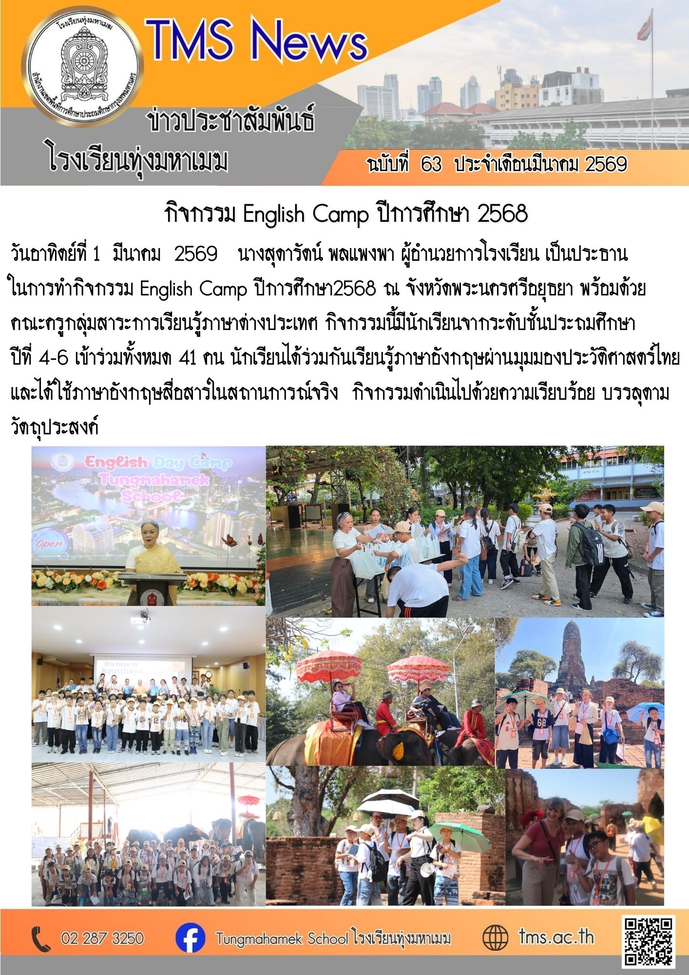 วันอาทิตย์ที่ 1 มีนาคม 2569 นางสุดารัตน์ พลแพงพา ผู้อำนวยการโรงเรียน เป็นประธานในการทำกิจกรรม English Camp ปีการศึกษา2568 ณ จังหวัดพระนครศรีอยุธยา พร้อมด้วยคณะครูกลุ่มสาระการเรียนรู้ภาษาต่างประเทศ กิจกรรมนี้มีนักเรียนจากระดับชั้นประถมศึกษาปีที่ 4-6 เข้าร่วมทั้งหมด 41 คน นักเรียนได้ร่วมกันเรียนรู้ภาษาอังกฤษผ่านมุมมองประวัติศาสตร์ไทยและได้ใช้ภาษาอังกฤษสื่อสารในสถานการณ์จริง กิจกรรมดำเนินไปด้วยความเรียบร้อย บรรลุตามวัตถุประสงค์