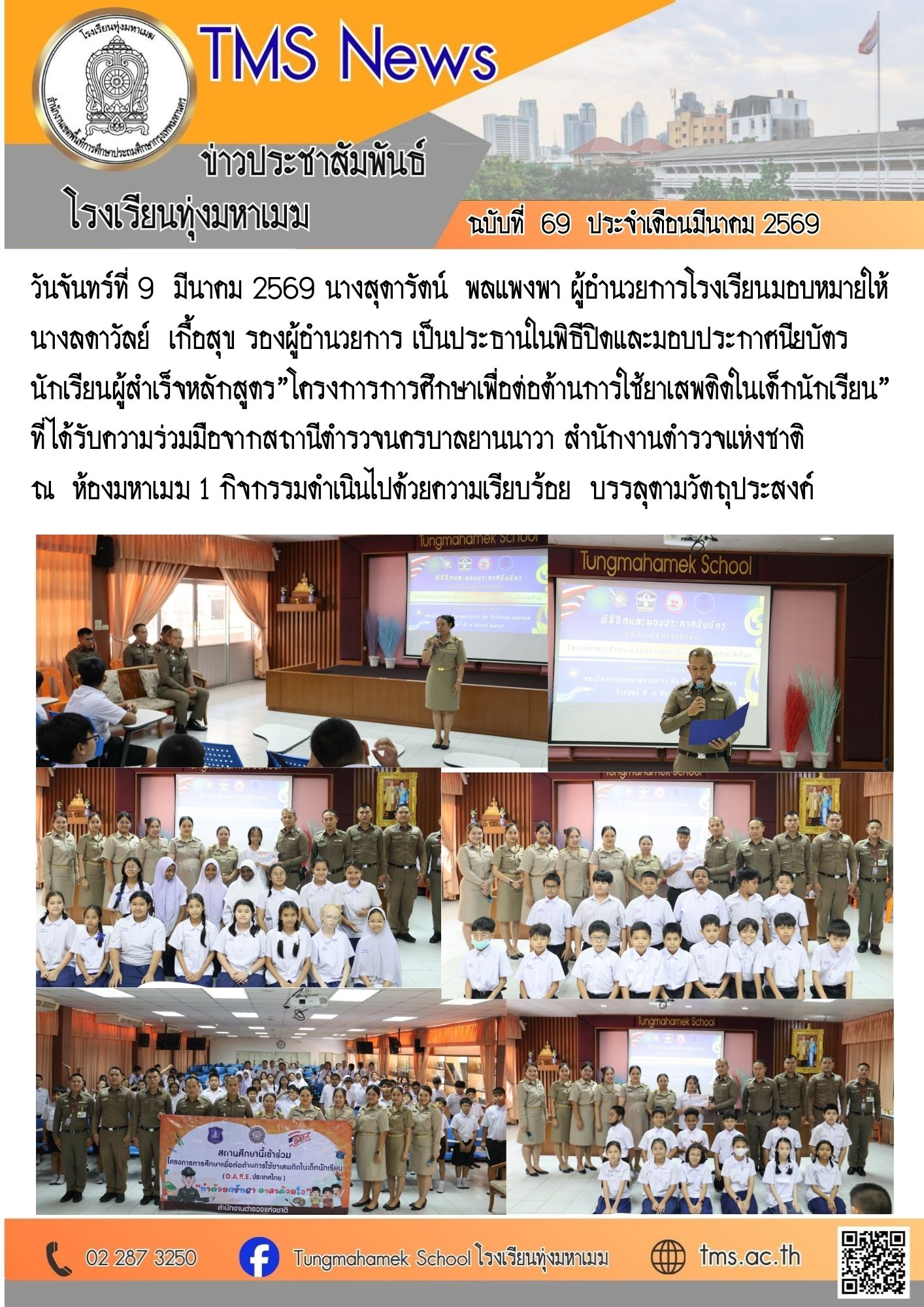 จันทร์ที่ 9 มีนาคม 2569 นางสุดารัตน์ พลแพงพา ผู้อำนวยการโรงเรียนมอบหมายให้นางลดาวัลย์ เกื้อสุข รองผู้อำนวยการ เป็นประธานในพิธีปิดและมอบประกาศนียบัตรนักเรียนผู้สำเร็จหลักสูตร”โครงการการศึกษาเพื่อต่อต้านการใช้ยาเสพติดในเด็กนักเรียน” ที่ได้รับความร่วมมือจากสถานีตำรวจนครบาลยานนาวา สำนักงานตำรวจแห่งชาติณ ห้องมหาเมฆ 1 กิจกรรมดำเนินไปด้วยความเรียบร้อย บรรลุตามวัตถุประสงค์