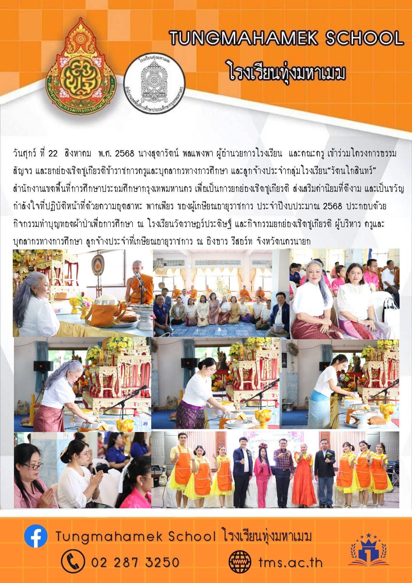 วันศุกร์ ที่ 22 สิงหาคม พ.ศ. 2568 นางสุดารัตน์ พลแพงพา ผู้อำนวยการโรงเรียน และคณะครู เข้าร่วมโครงการธรรมสัญจร และยกย่องเชิดชูเกียรติข้าราชการครูและบุคลากรทางการศึกษา และลูกจ้างประจํากลุ่มโรงเรียน“รัตนโกสินทร์” สำนักงานเขตพื้นที่การศึกษาประถมศึกษากรุงเทพมหานคร เพื่อเป็นการยกย่องเชิดชูเกียรติ ส่งเสริมค่านิยมที่ดีงาม และเป็นขวัญกําลังใจที่ปฏิบัติหน้าที่ด้วยความอุตสาหะ พากเพียร ของผู้เกษียณอายุราชการ ประจำปีงบประมาณ 2568 ประกอบด้วยกิจกรรมทำบุญทอดผ้าป่าเพื่อการศึกษา ณ โรงเรียนวัดราษฎร์ประดิษฐ์ และกิจกรรมยกย่องเชิดชูเกียรติ ผู้บริหาร ครูและบุคลากรทางการศึกษา ลูกจ้างประจําที่เกษียณอายุราชการ ณ อิงธาร รีสอร์ท จังหวัดนครนายก